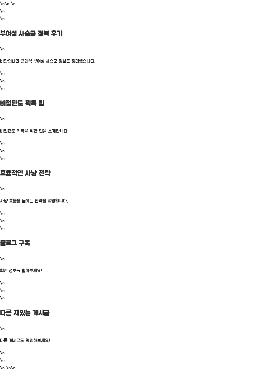 | 부여성 사슴굴 | (42, 27) | 상대적으로 한산, 조용한 사냥 가능 | 20~40 | 사슴고기, 비철단도 |