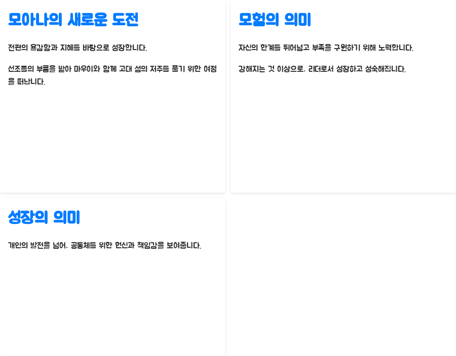 | 줄거리 | 선조들의 부름을 받은 모아나가 고대 섬의 저주를 깨기 위한 모험을 떠나는 이야기 |