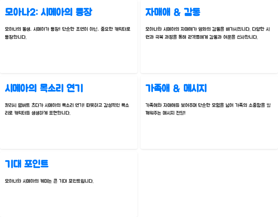 시메아를 통해 가족애와 자매애를 보여주는 모아나2는, 단순한 모험을 넘어 가족의 소중함을 일깨워주는 메시지를 전달합니다. 모아나와 시메아 자매의 케미는 이번 영화의 가장 큰 기대 포인트 중 하나입니다.