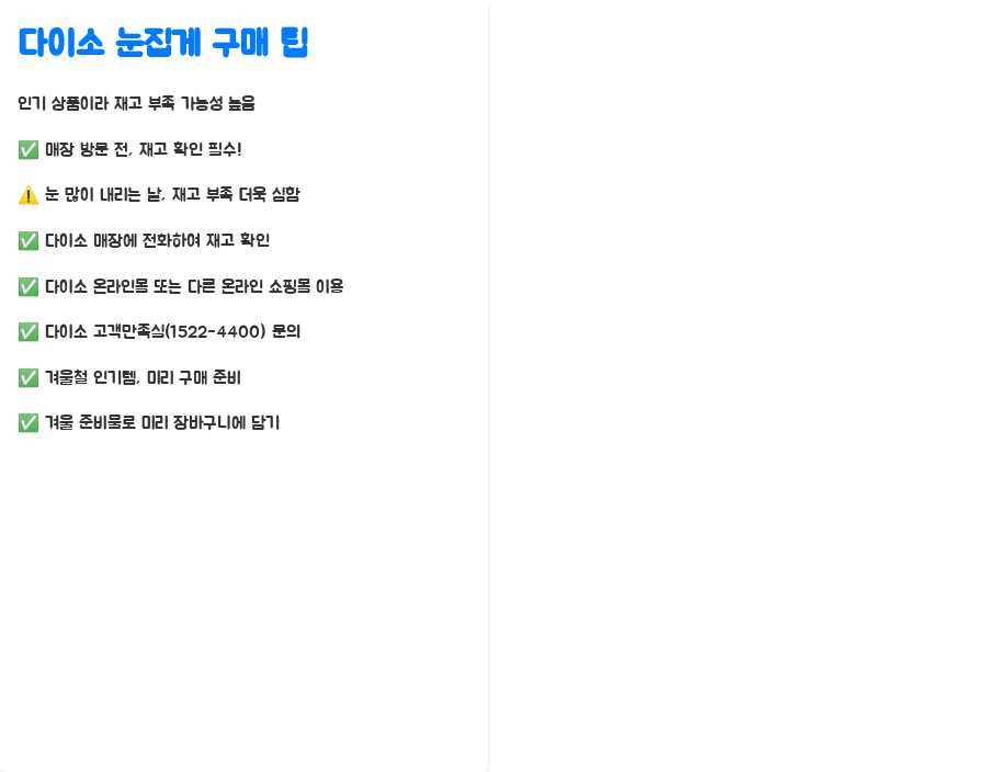 다이소 고객만족실(1522-4400)에 전화해서 가까운 매장의 재고를 확인하는 방법도 있습니다. 다이소 눈집게는 겨울철 인기 아이템이므로, 눈이 내리기 전에 미리 준비하는 것이 좋습니다.