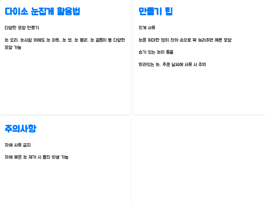 | 스노우볼 메이커 | 1,000원 | 눈싸움용 눈뭉치 제작 |