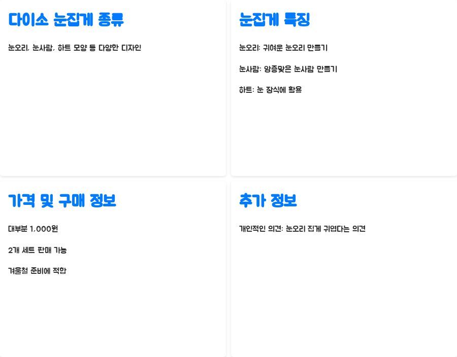 다이소 눈집게는 눈오리, 눈사람 뿐만 아니라 다양한 모양을 만들 수 있다는 사실, 알고 계셨나요? 눈 하트, 눈 별, 심지어 눈 펭귄, 눈 곰돌이까지 만들 수 있다니 놀랍죠?