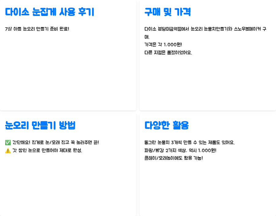 다이소 죽전본점에서는 이미 품절이었다고 합니다. 눈오리 눈뭉치만들기와 스노우볼메이커를 구입했는데, 가격은 놀랍게도 각 1,000원이었습니다!