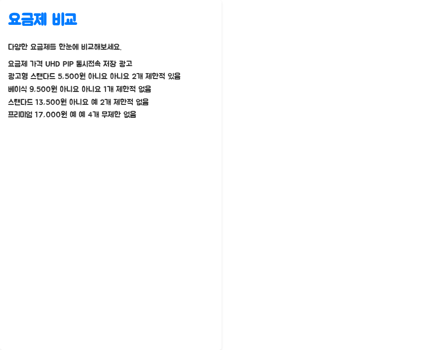 요금제 가격 (원) UHD 지원 PIP 지원 동시 접속 오프라인 저장 광고