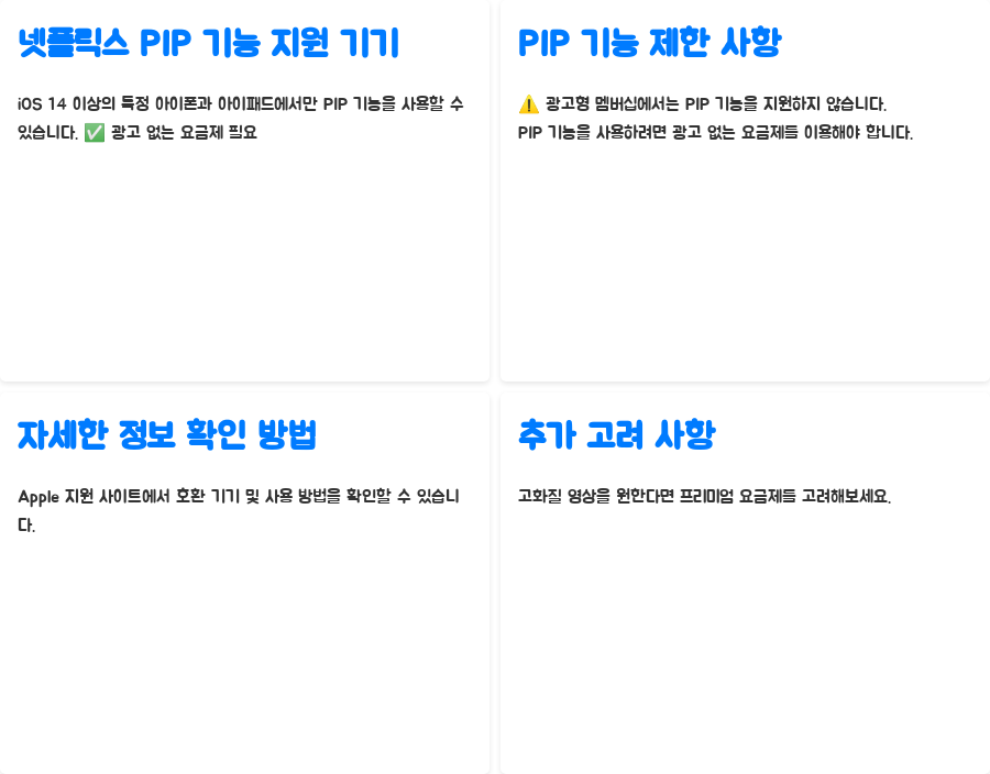 넷플릭스 PIP 기능은 iOS 14 이상의 특정 아이폰과 아이패드 모델에서만 지원됩니다. 하지만 중요한 점은, 광고형 멤버십에서는 PIP 기능이 제공되지 않는다는 것입니다.