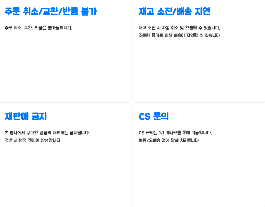 CS 문의는 1:1 게시판을 통해서만 가능하며, 불량이나 오배송 건에 한해서만 처리됩니다.