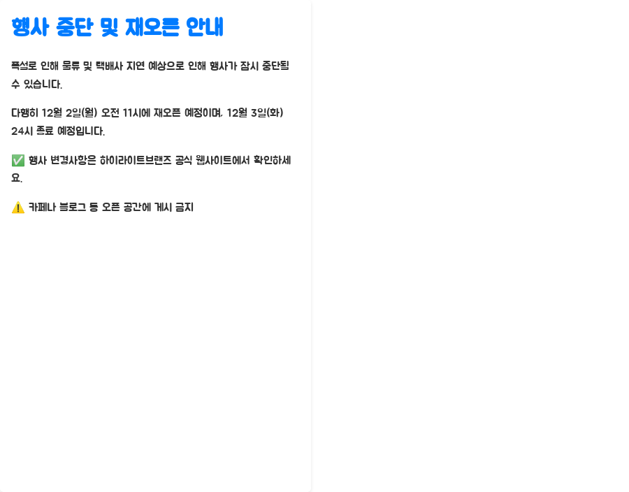 폭설로 인해 물류 및 택배사 지연이 예상되어 잠시 행사가 중단되었을 수 있습니다.