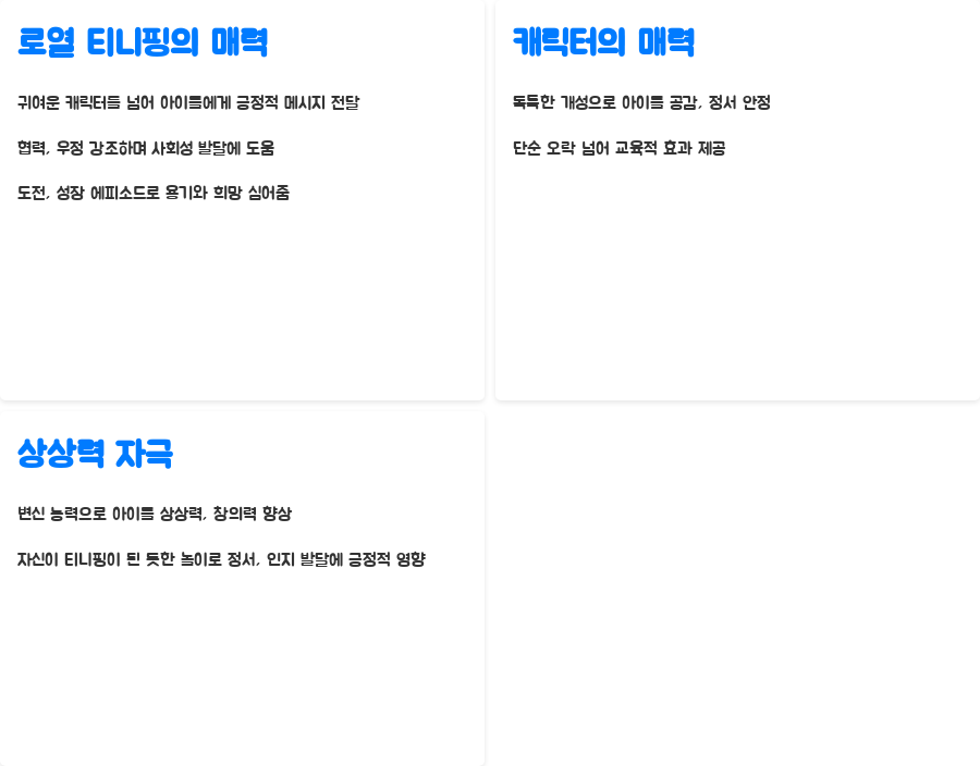 이러한 다양한 캐릭터들의 조합은 단순한 재미를 넘어, 아이들의 사회성과 정서적 성장에 긍정적인 영향을 미칩니다.