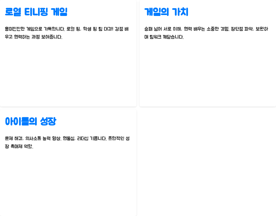 | 교육적 효과 | 사회성 발달, 문제 해결 능력 향상, 창의력 증진, 정서적 안정 |