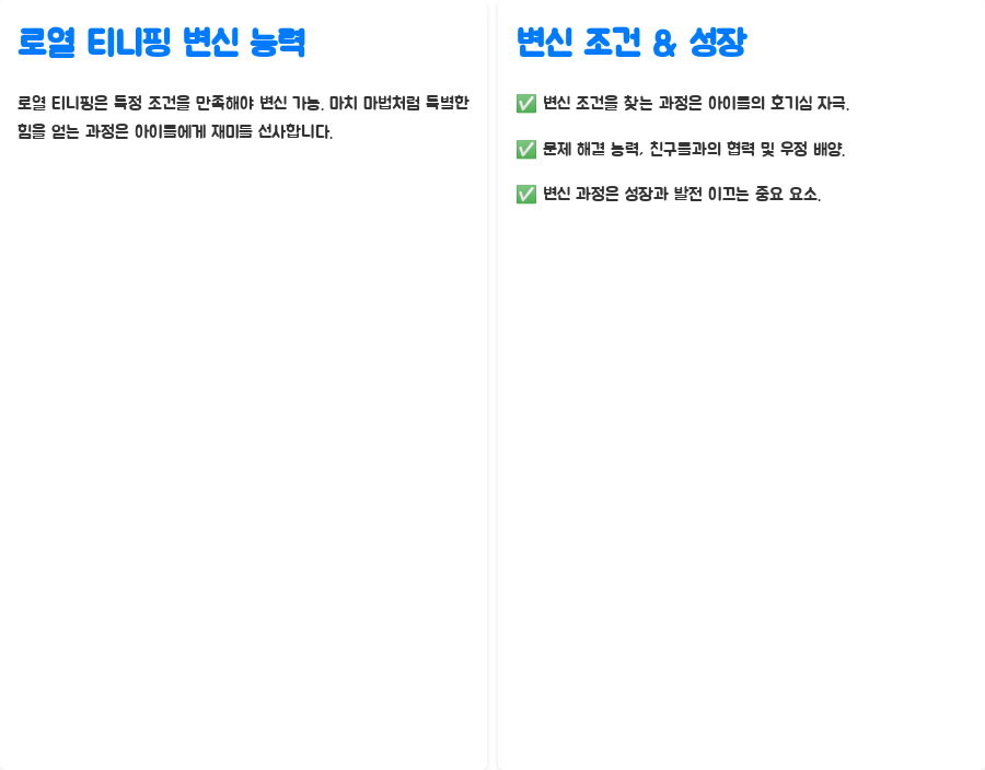 이러한 설정은 아이들의 호기심을 자극하고, 스스로 문제를 해결하며 성장해야 하는 과정을 보여줍니다. 변신을 위한 조건이 무엇인지, 어떤 과정을 거쳐야 하는지 아이들은 끊임없이 질문하고 탐구하며 문제 해결 능력을 키워나가게 되는 것이죠.