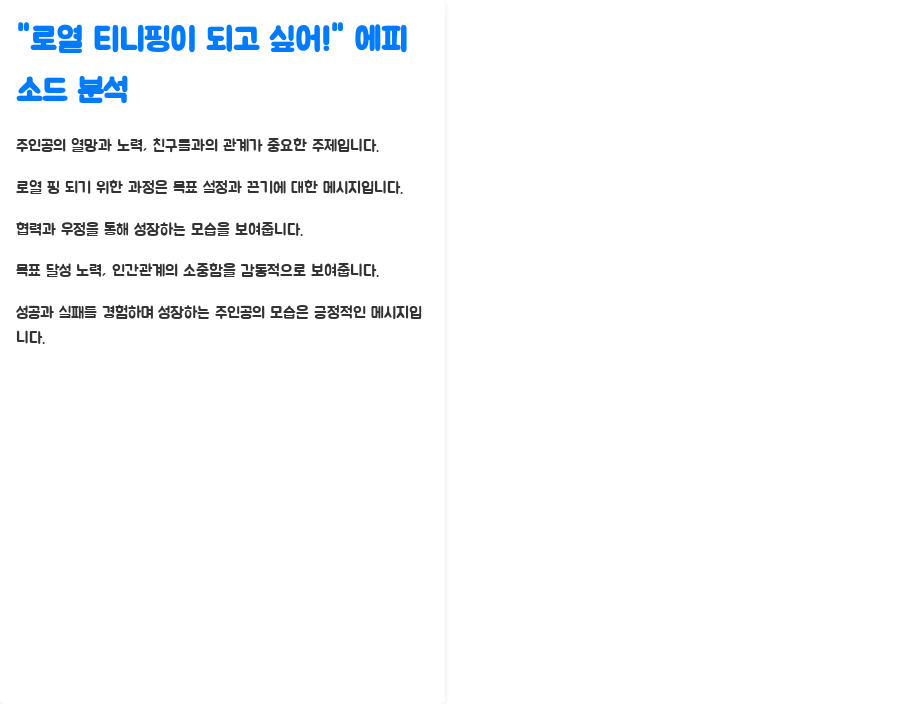 단순히 로열 핑이 되는 것에 그치지 않고, 그 과정에서 친구들과의 협력과 우정을 통해 성장하는 모습을 보여주는 점이 인상적입니다. 이 에피소드는 목표 달성을 위한 노력의 중요성과 인간관계의 소중함을 감동적으로 보여줍니다.