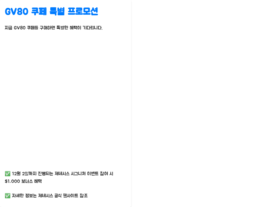 GV80 쿠페 프로모션에 대한 자세한 정보는 제네시스 공식 웹사이트에서 확인 가능합니다.