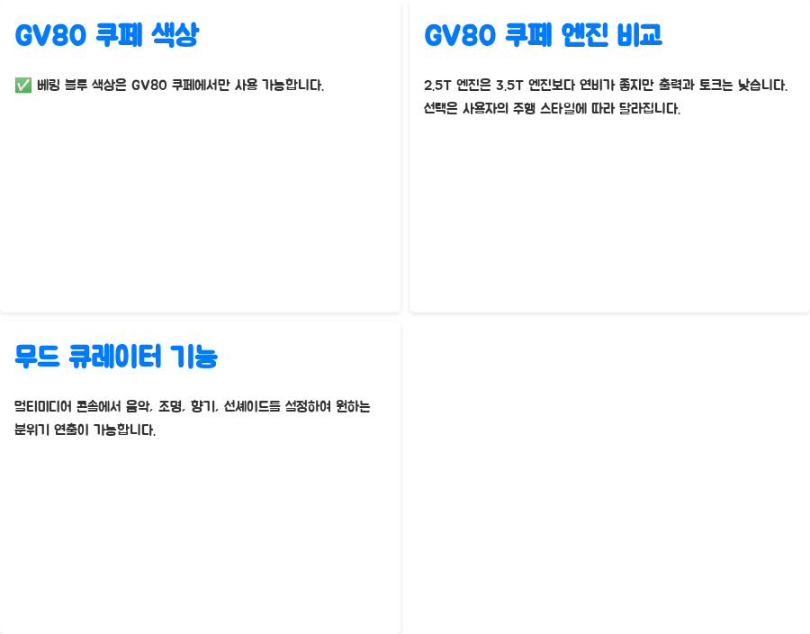 A1. 네, 현재로서는 베링 블루 색상은 GV80 쿠페에서만 만나볼 수 있는 독점적인 색상입니다.
