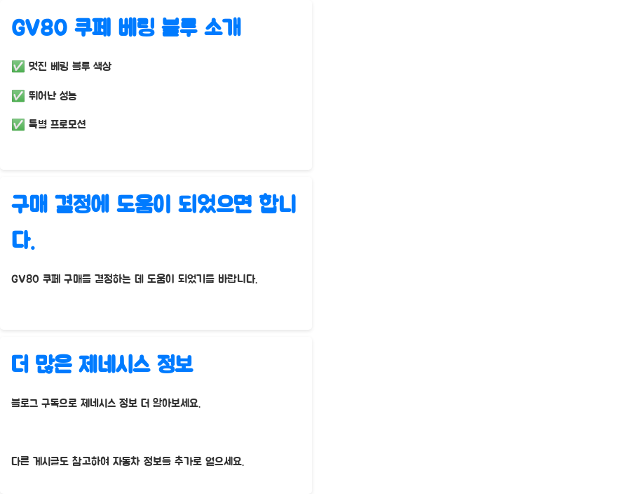 오늘 알아본 GV80 쿠페 베링 블루, 어떠셨나요? 베링 블루의 매력적인 색상부터 압도적인 성능, 그리고 놓칠 수 없는 프로모션까지, 여러분의 드림카를 위한 모든 것을 담았습니다.