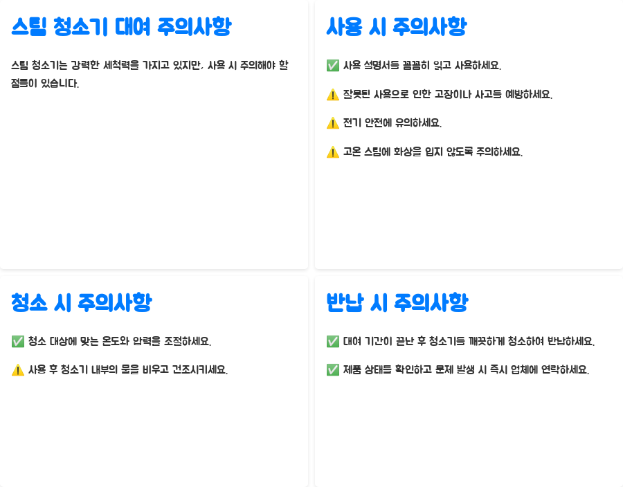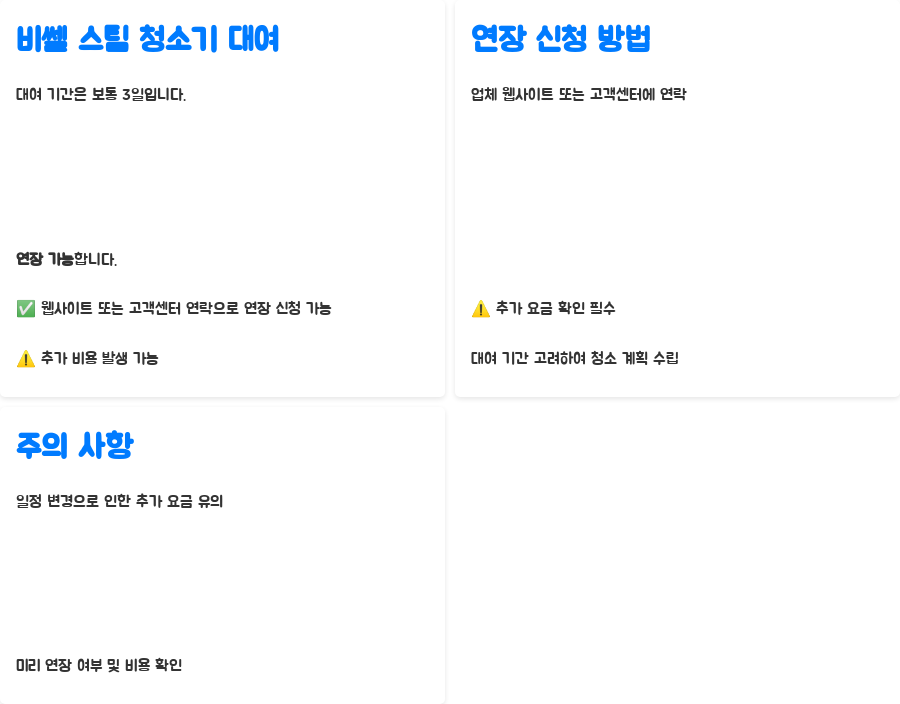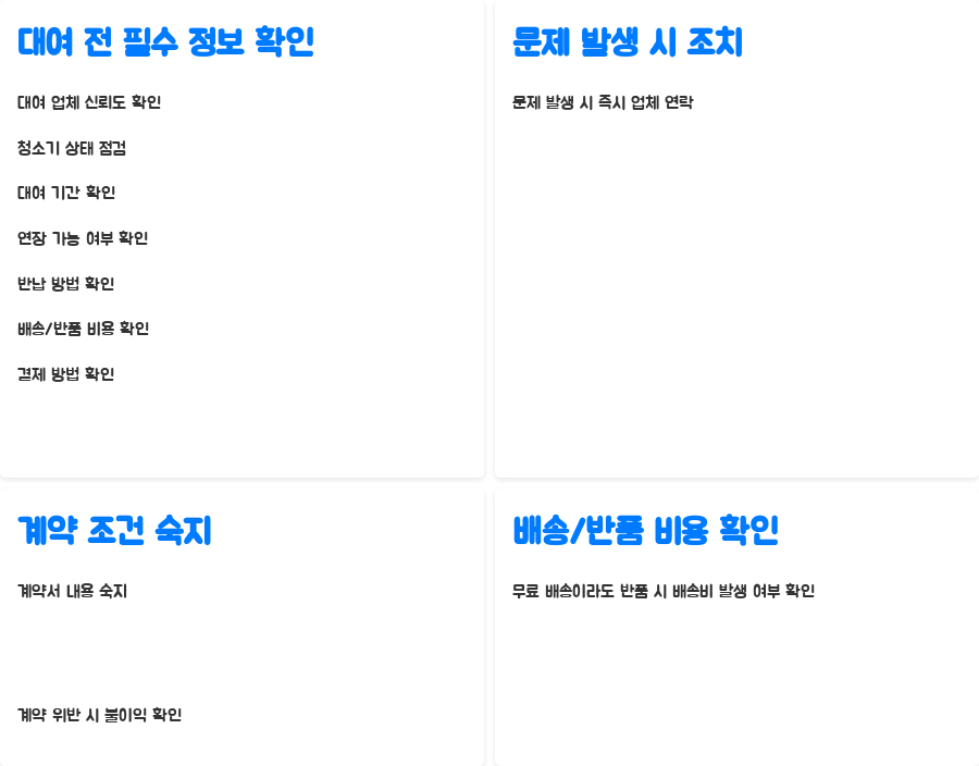 대여 전에 모든 조건을 명확하게 확인하여, 쾌적한 청소와 함께 스트레스 없는 대여 경험을 누리시길 바랍니다.