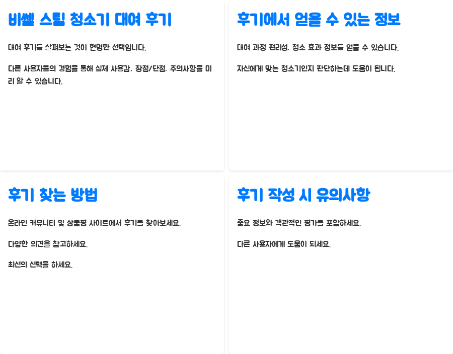 후기를 통해 대여 과정의 편리성, 청소 효과 등에 대한 정보를 얻을 수 있고, 자신에게 맞는 청소기인지 판단하는데 도움이 됩니다.
