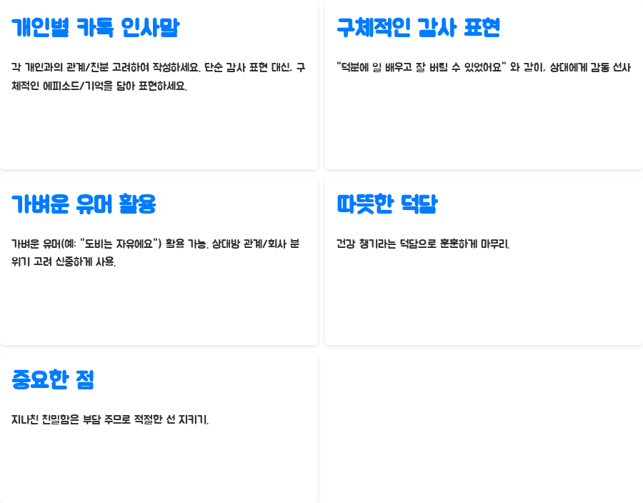 | 개인 카톡(상사) | 팀장님, 늘 격려해주셔서 감사했습니다. 배운 점 많습니다. 건강하세요! | 감사, 존경, 덕담 |