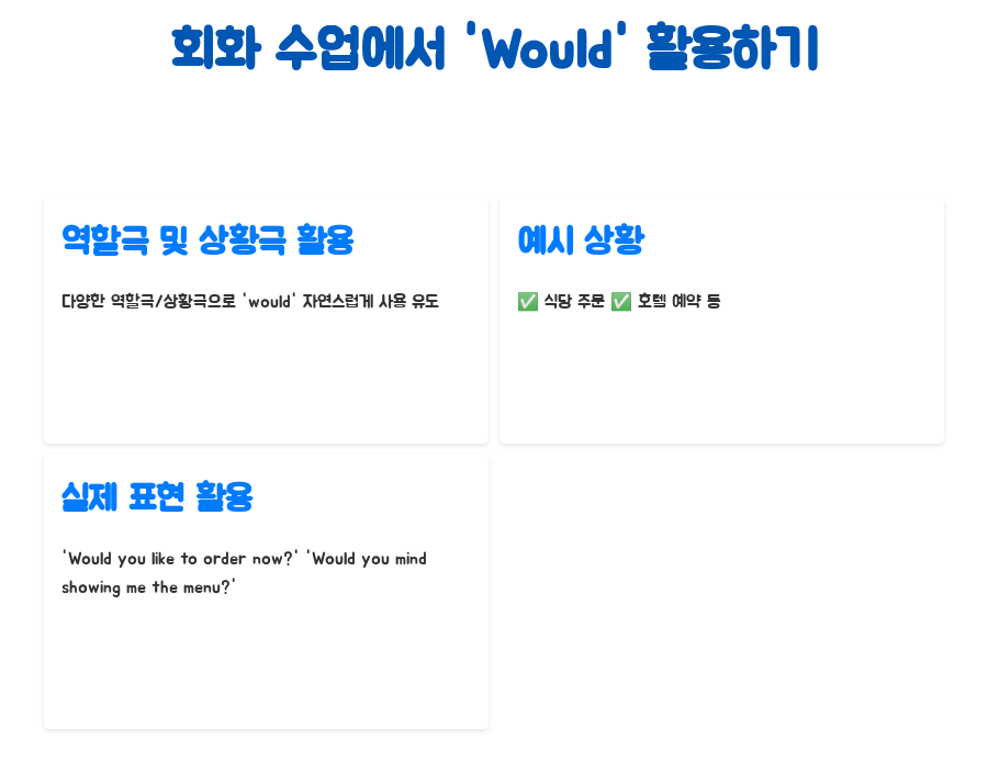 - 영어 강의에서는 회화 연습이나 ESL 과정에서 'would'를 활용한 다양한 표현을 익히도록 합니다.