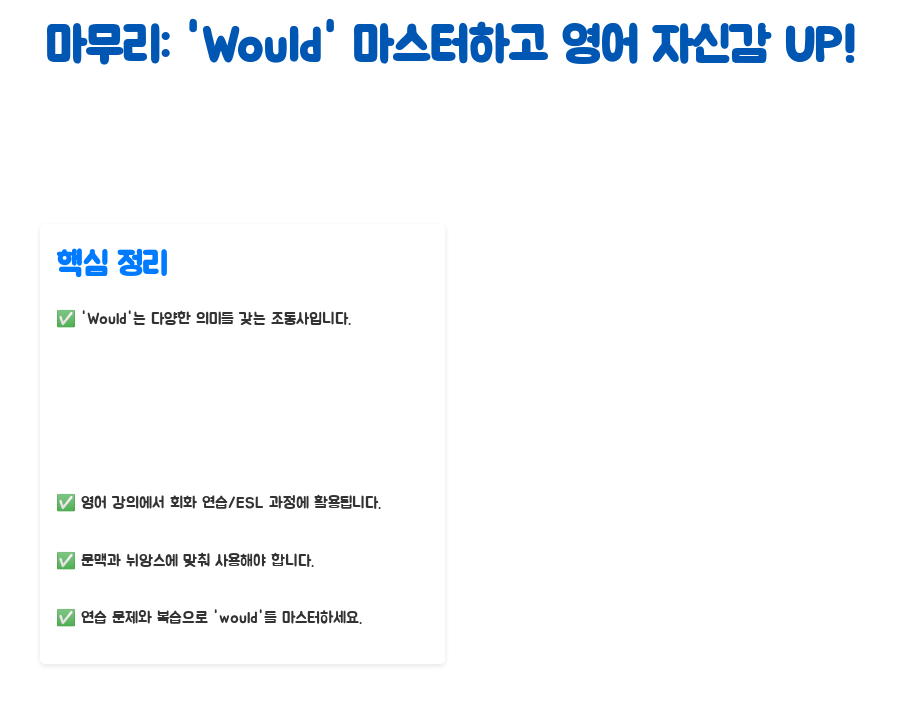 이 글이 여러분의 영어 공부에 도움이 되었기를 바랍니다! 'Would'를 마스터하고 영어 자신감을 키우세요!