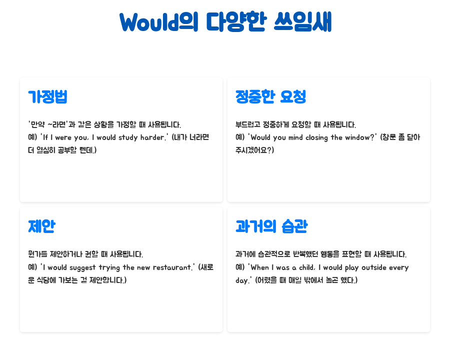 - 'Would'는 가정법, 요청, 제안, 과거의 습관 등 다양한 의미를 갖는 조동사입니다.
