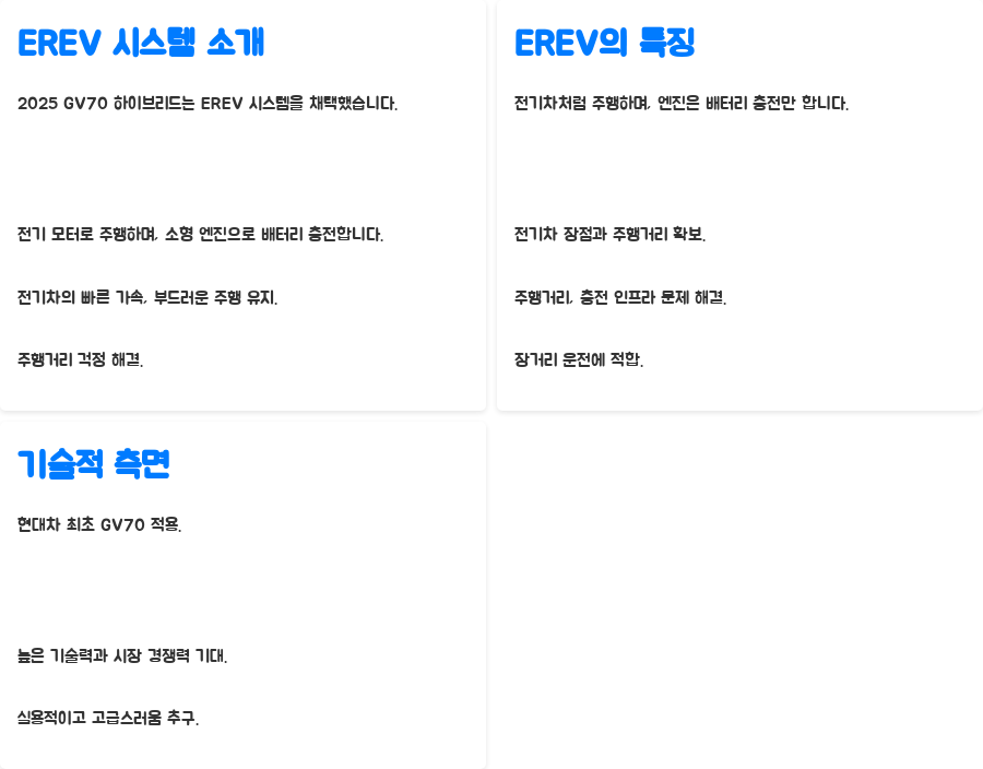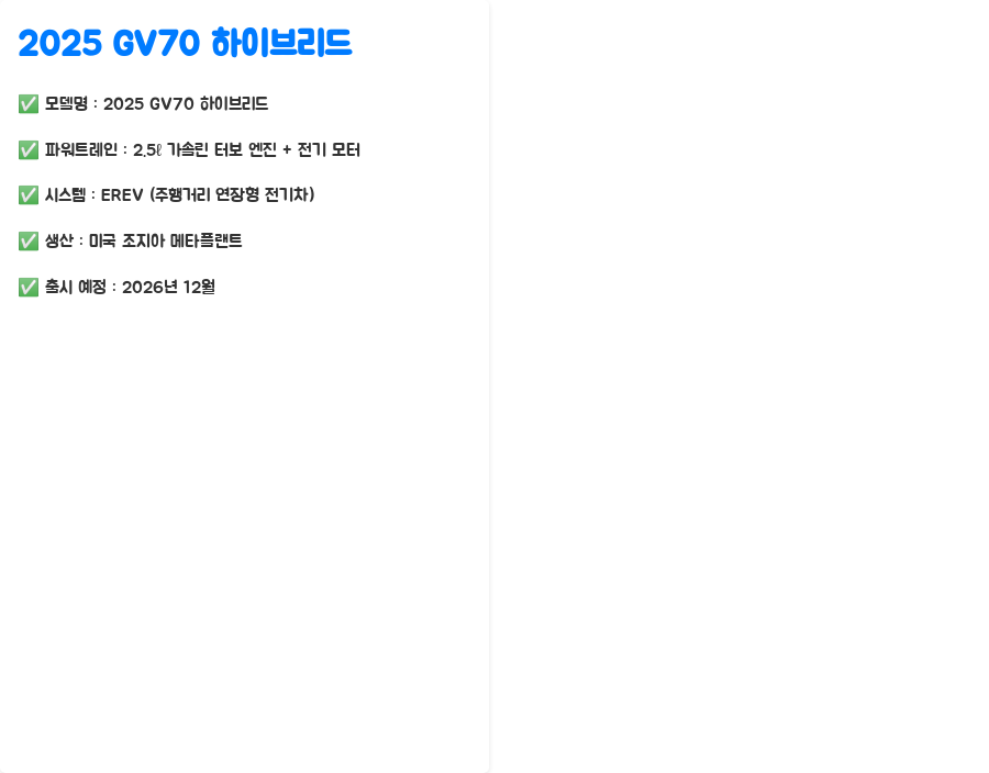 2025 GV70 하이브리드의 가장 큰 특징은 바로 EREV(Extended Range Electric Vehicle) 시스템 채택입니다.