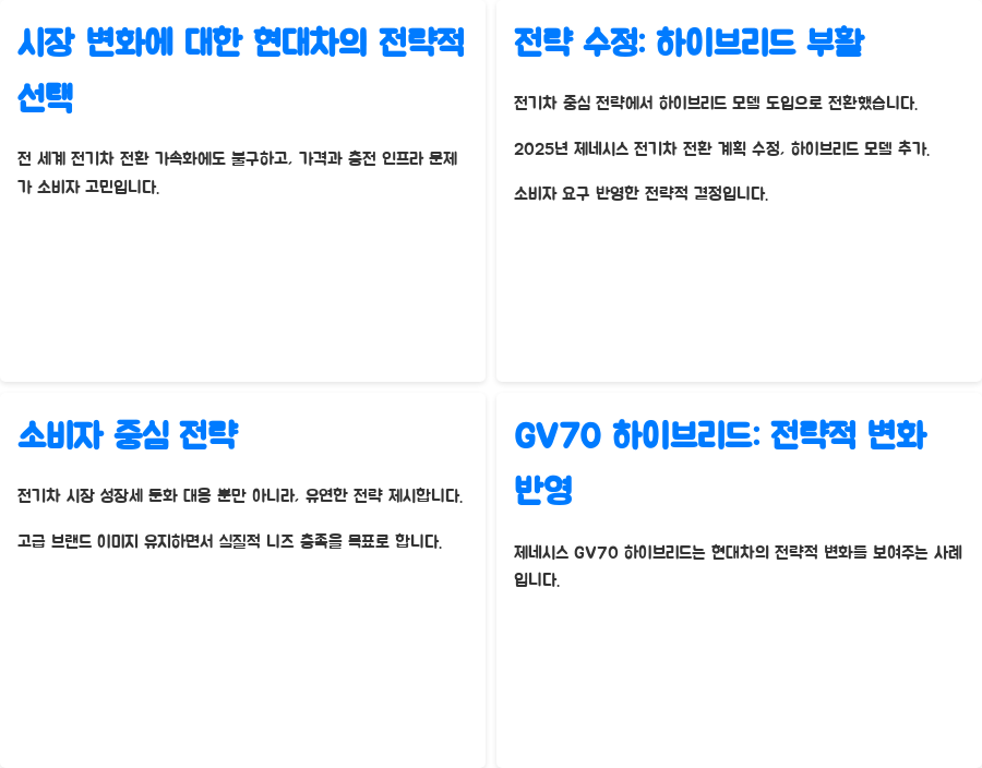 현대차는 이러한 시장 변화를 정확하게 포착하고, 전기차 중심 전략에서 하이브리드 모델 도입으로 전략을 수정했습니다.