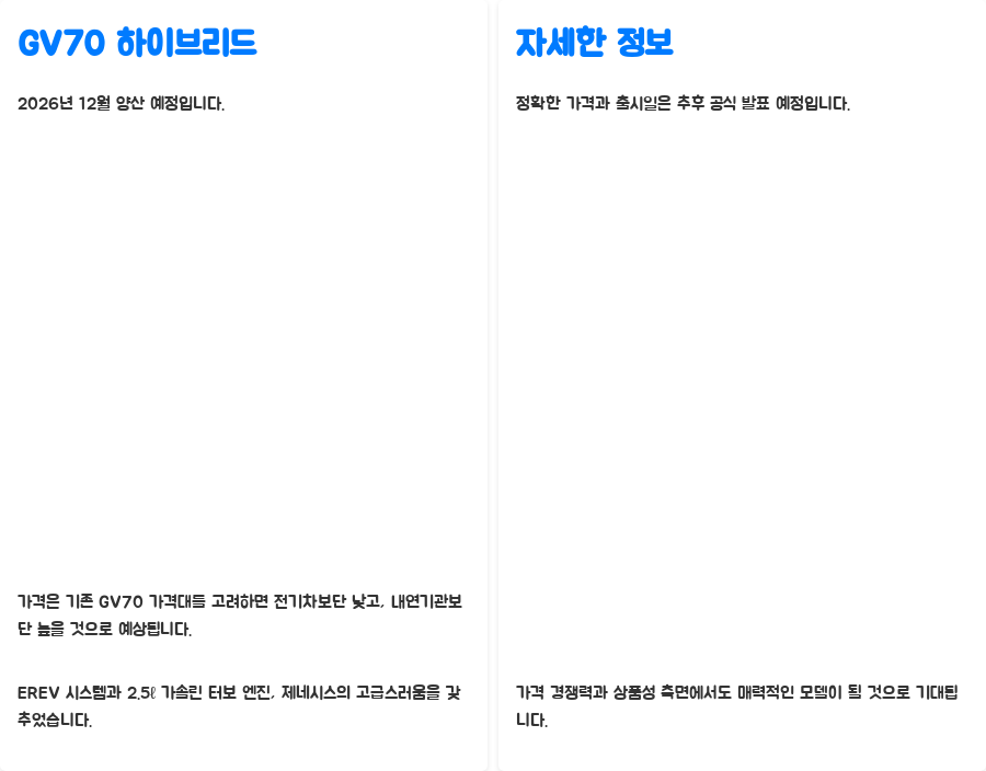 현재 GV70의 가격대를 고려할 때, 하이브리드 모델은 내연기관 모델보다는 다소 높지만, 전기차 모델보다는 낮은 가격대로 출시될 가능성이 높습니다.
