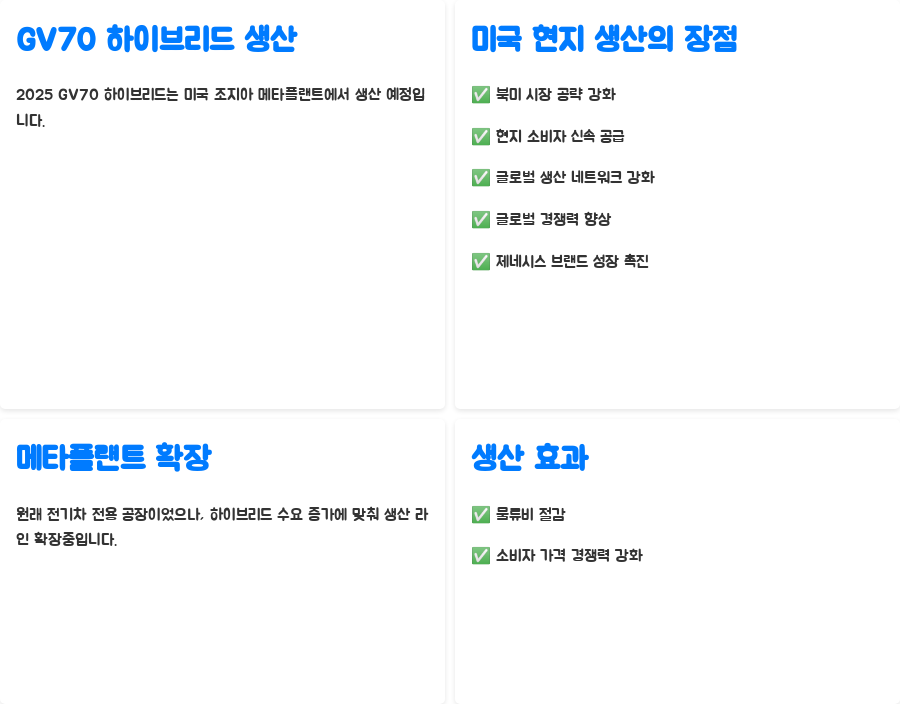 미국 현지 생산은 북미 시장 공략에 유리하며, 현지 소비자들에게 보다 신속하게 차량을 공급할 수 있다는 장점이 있습니다.