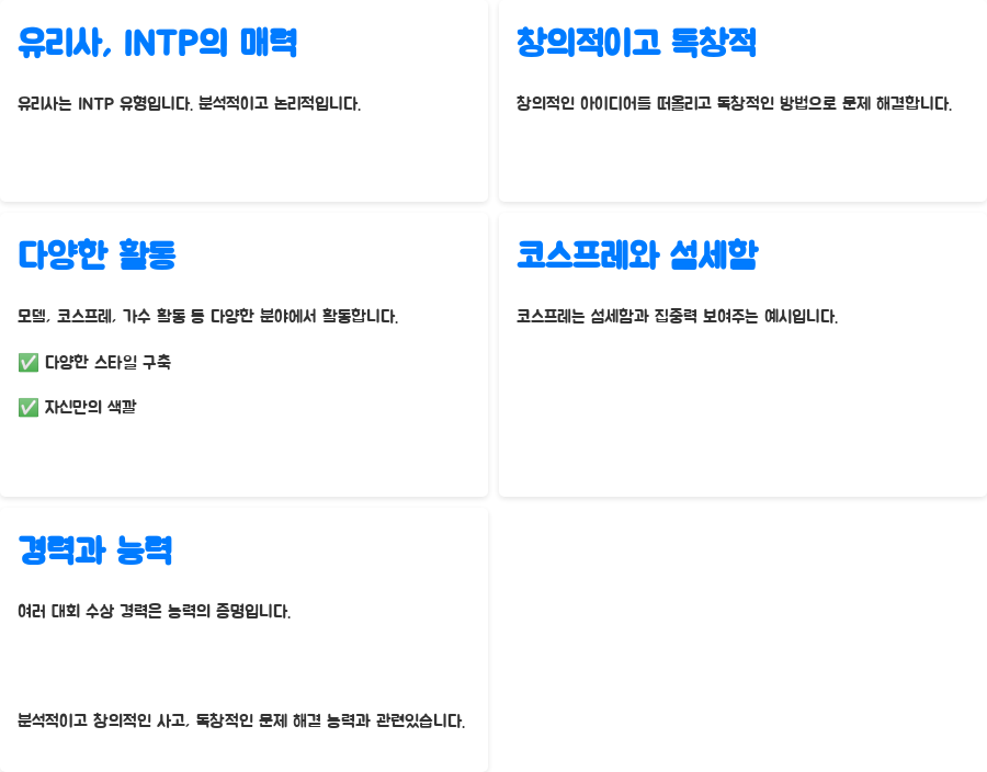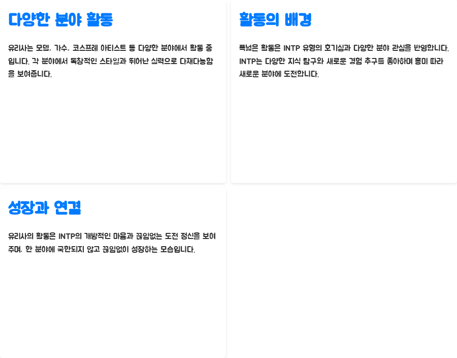 유리사의 다양한 활동은 바로 이러한 INTP의 개방적인 마음과 끊임없는 도전 정신을 보여줍니다.