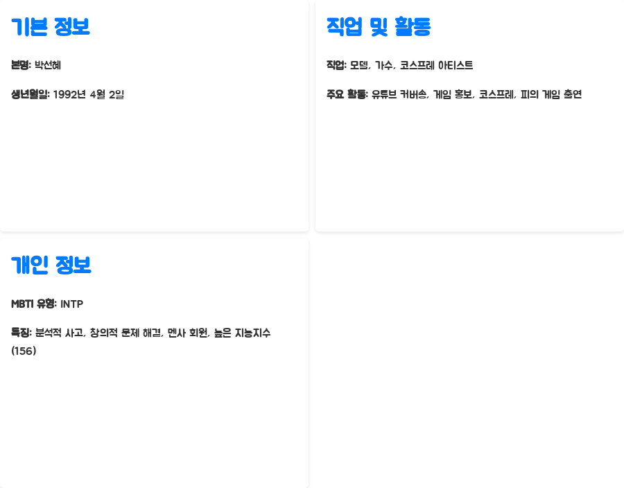 | 주요 활동 | 유튜브 커버송, 다양한 게임 홍보 모델, 코스프레 대회 참가 및 수상, '피의 게임' 출연 |