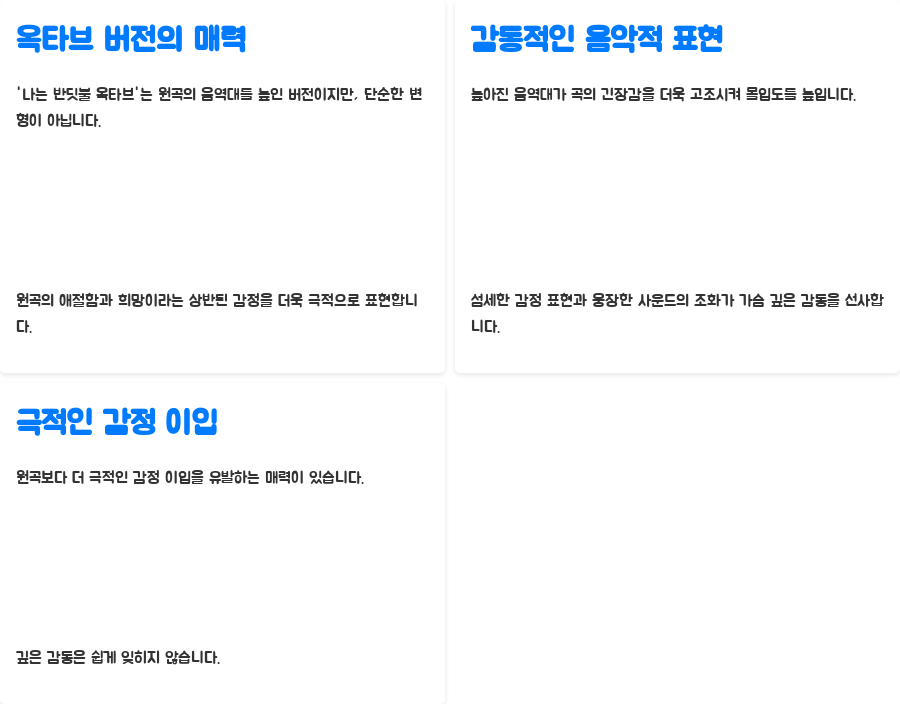 원곡의 서정적인 멜로디는 그대로 유지하면서 높은 음역대가 더해져 훨씬 웅장하고 깊이 있는 사운드를 자랑하죠.