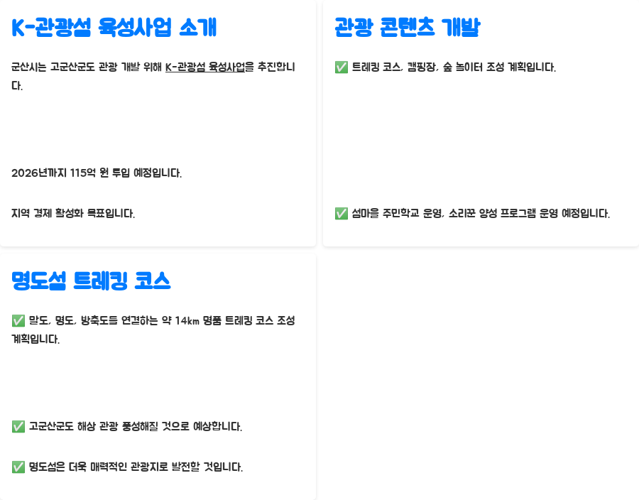 | 관광 개발 | K-관광섬 육성사업 (2026년까지 115억 원 투입) |