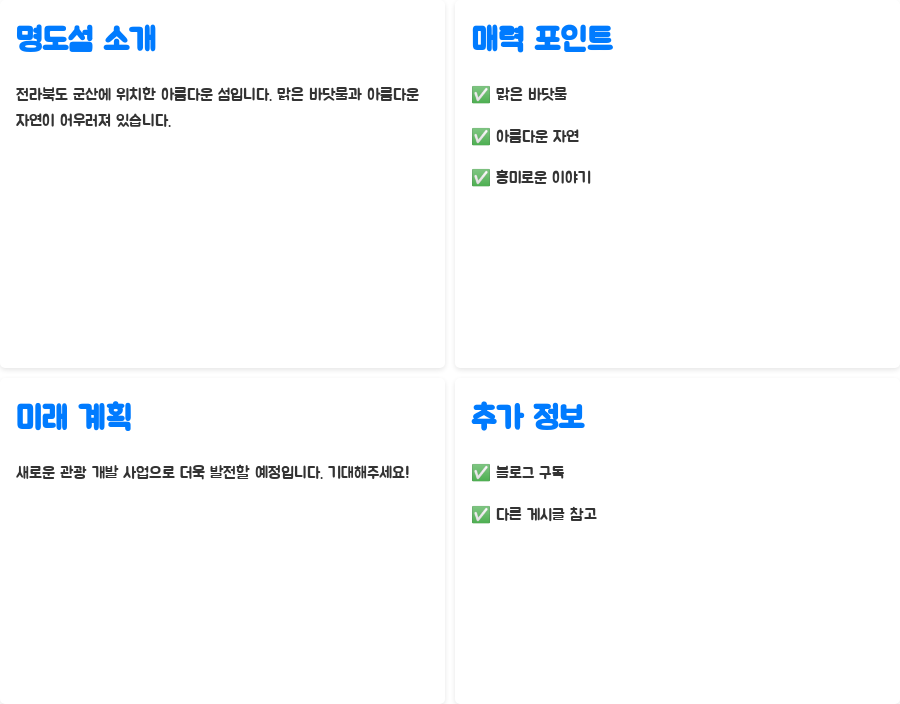 곧 다가올 새로운 관광 개발 사업으로 더욱 발전할 명도섬에 대한 기대감을 갖게 되셨기를 바랍니다! 더욱 자세한 정보는 저희 블로그의 다른 게시글을 통해 확인해보세요!
