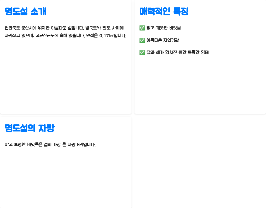 오늘은 전라북도 군산의 숨은 보석, 명도섬에 대해 알아보았습니다. 맑은 물과 아름다운 자연, 그리고 흥미로운 이야기까지 가득한 명도섬, 어떠셨나요?