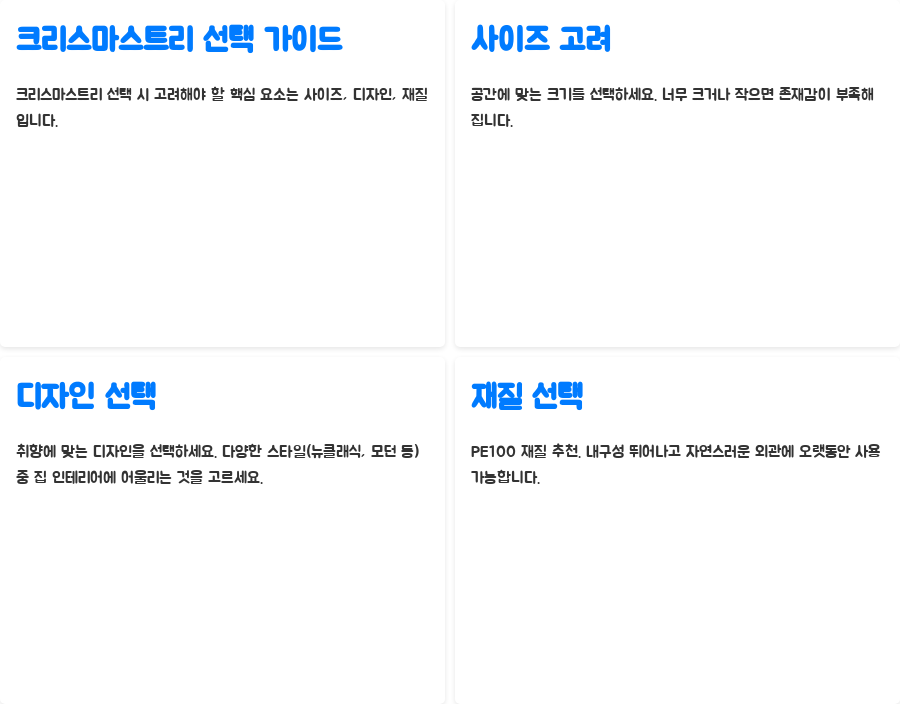 이 세 가지 요소만 잘 고려해도, 만족스러운 크리스마스트리를 고르는 데 큰 도움이 될 것입니다.