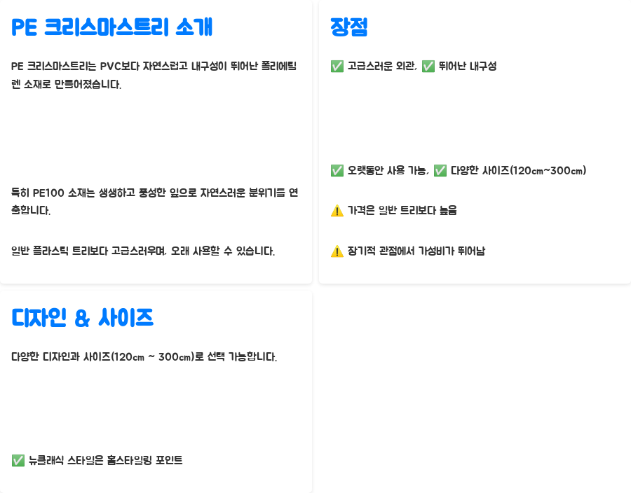 크리스마스 트리를 고를 때 디자인과 내구성을 동시에 잡고 싶다면 PE 소재, 특히 PE100을 선택하는 것이 현명한 방법입니다.