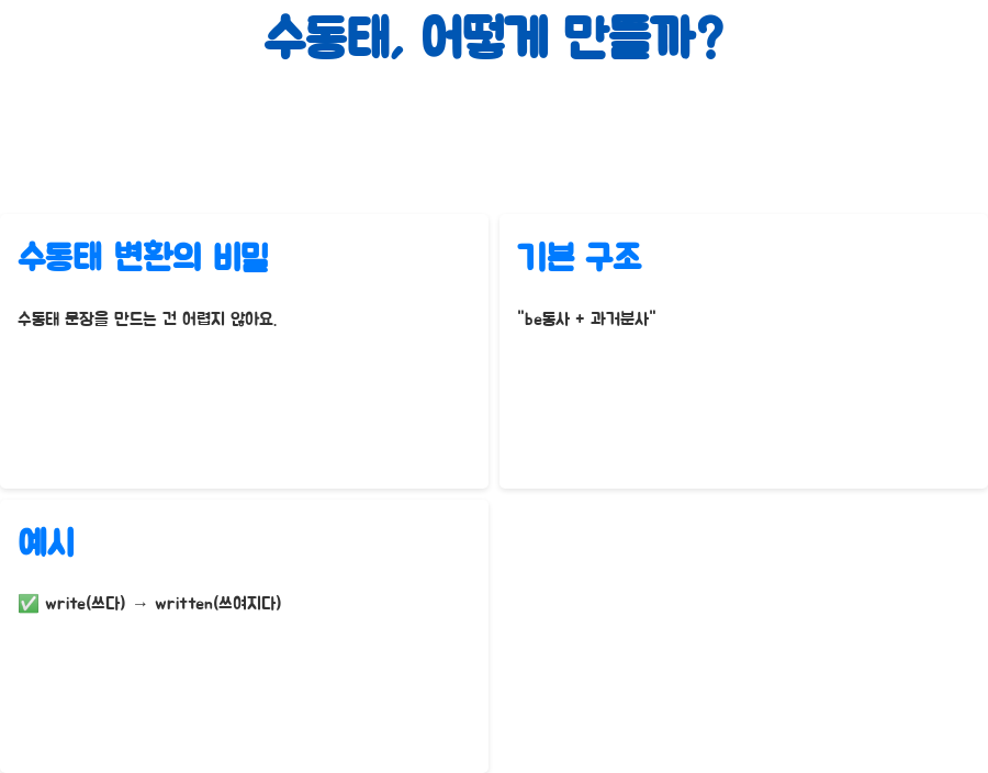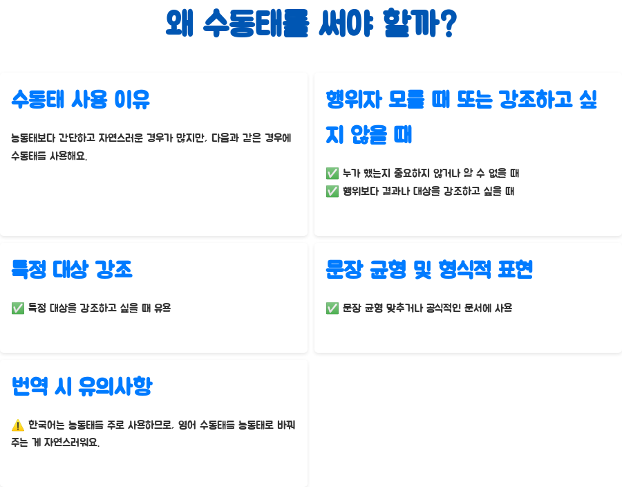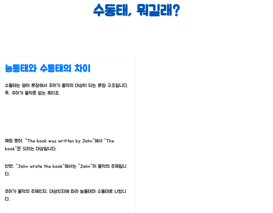 음… 솔직히 말해서, 수동태라는 단어만 들어도 머리가 띵해지는 분들도 계실 거예요. 뭐, 어려운 거 맞아요. 하지만 막상 알고 보면 그렇게 복잡하지 않다는 거!