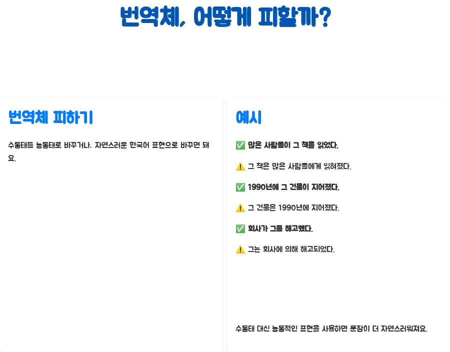 번역체를 피하려면, 수동태를 능동태로 바꾸거나, 좀 더 자연스러운 한국어 표현으로 바꿔주면 돼요.