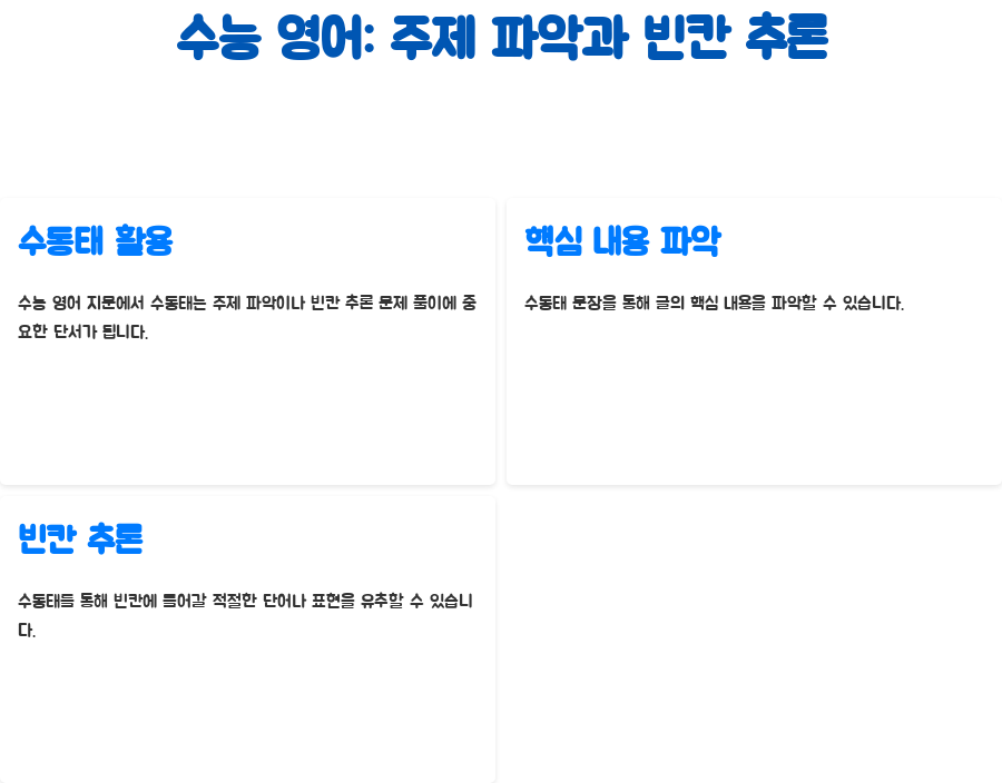 수능 영어 지문에서 수동태는 주제 파악이나 빈칸 추론 문제를 푸는 데 중요한 단서가 될 수 있어요. 수동태 문장을 통해 글의 핵심 내용을 파악하고, 빈칸에 들어갈 가장 적절한 단어나 표현을 유추할 수 있죠.