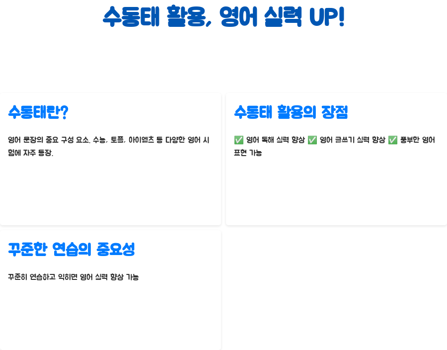 수동태에 대한 이해를 바탕으로, 꾸준히 연습하고 익힌다면, 여러분의 영어 실력이 한층 더 업그레이드될 거예요!