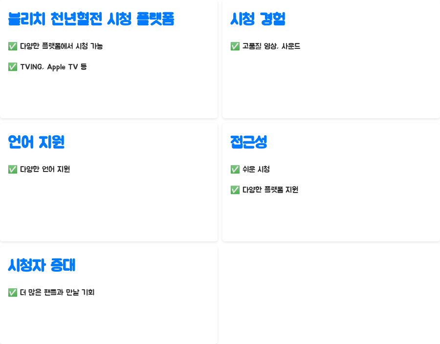 이를 통해 더 많은 팬들이 블리치 천년혈전의 매력을 경험할 수 있는 기회를 제공합니다. 다양한 플랫폼 지원은 시청자의 편의성을 높입니다.