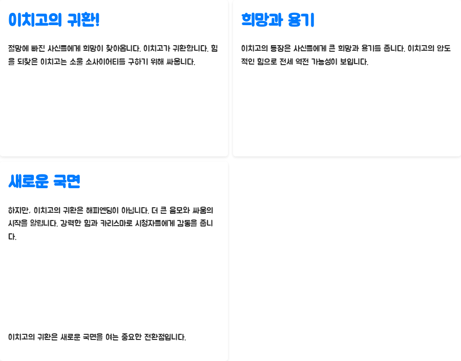 절망에 빠진 사신들에게 한 줄기 희망이 찾아옵니다. 바로 주인공 쿠로사키 이치고의 귀환입니다. 잠시 사신의 힘을 잃었던 이치고는 다시 한번 사신으로서의 힘을 되찾고, 소울 소사이어티를 구하기 위해 전투에 뛰어듭니다.