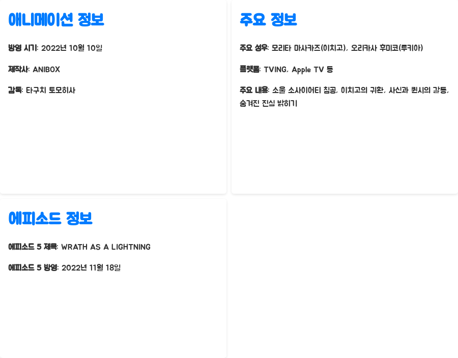 2022년에 방영된 ANIBOX의 애니메이션으로, 타구치 토모히사 감독의 섬세한 연출과 모리타 마사카즈, 오리카사 후미코 등 최고의 성우들의 참여가 빛나는 작품입니다. 단 한 편도 놓칠 수 없는 블리치 천년혈전의 세계에 빠져보세요! 압도적인 스케일의 전투와 흥미로운 스토리는 놓칠 수 없습니다.