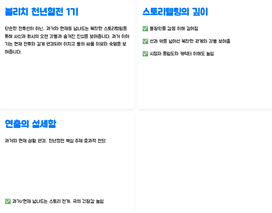 블리치 천년혈전 1기는 단순한 전투씬만을 보여주는 것이 아닙니다. 과거와 현재를 오가는 복잡한 스토리텔링을 통해 사신들과 퀸시 사이의 오랜 갈등과 숨겨진 진실을 흥미롭게 풀어냅니다. 과거의 이야기는 현재의 전투와 긴밀하게 연결되어 있으며, 이치고와 그의 동료들이 싸우는 이유와 그들의 숙명을 보여줍니다.