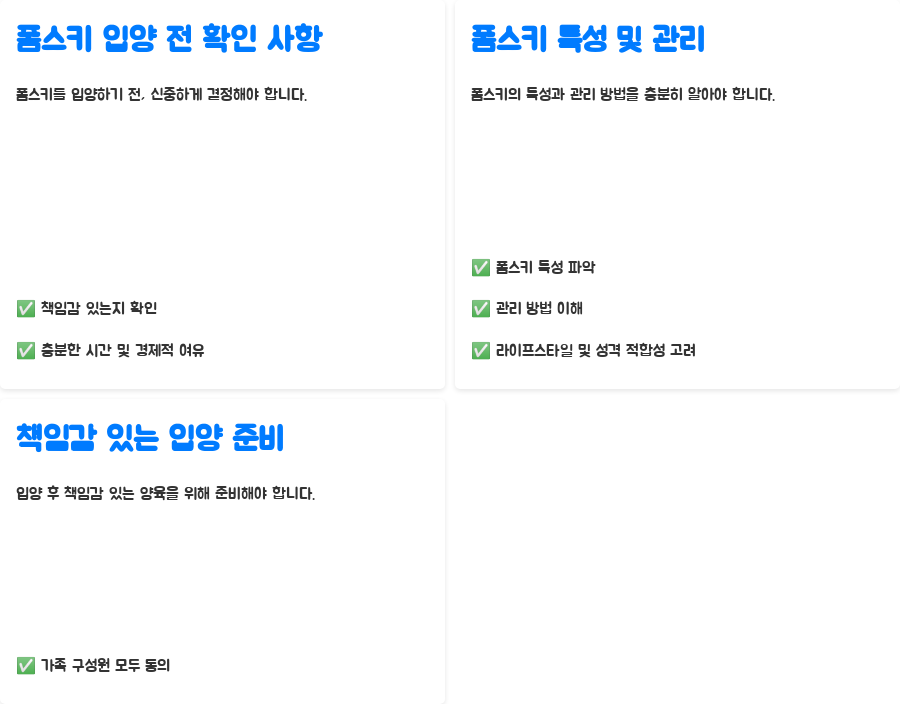 폼스키의 특성과 관리 방법에 대해 충분히 알아보고, 자신의 라이프스타일과 폼스키의 성격이 잘 맞는지 확인해야 합니다. 입양 후 책임감 있는 양육을 위한 준비도 잊지 마세요. 폼스키는 가족 구성원 모두의 동의가 필요합니다.