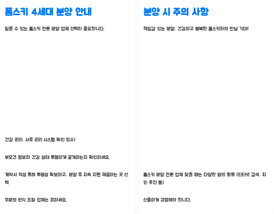 폼스키 4세대를 분양받고 싶다면, 믿을 수 있는 폼스키 전문 분양 업체를 선택하는 것이 매우 중요합니다. 철저한 건강 관리와 사후 관리 시스템을 갖춘 곳을 찾아야 하며, 부모견의 정보와 건강 상태를 투명하게 공개하는 곳인지 확인해야 합니다.