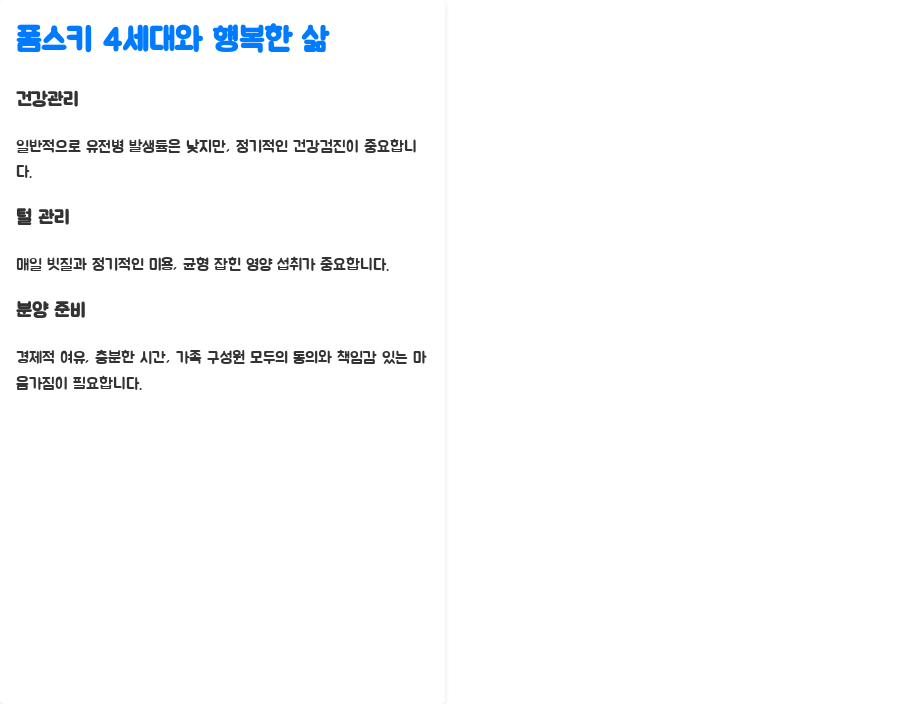 오늘은 폼스키 4세대의 매력과 함께, 폼스키를 입양하고 싶은 분들을 위한 유용한 정보들을 꼼꼼하게 알려드리겠습니다! 반려견 입양을 고민 중이시라면, 이 글이 큰 도움이 될 거예요!