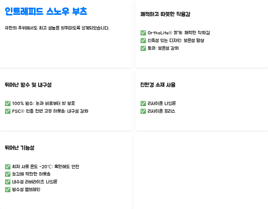 | 비건 윈더러 스노우 부츠 | 비건 소재, 따뜻함 유지, 스타일리시 | 비건 소재 | - |