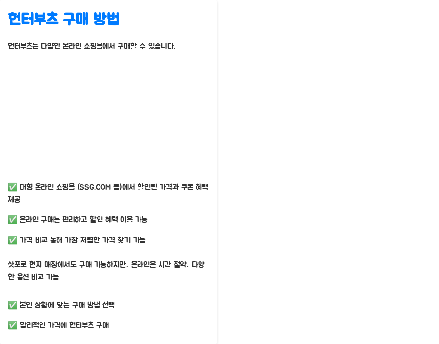 A3. 헌터부츠는 SSG.COM과 같은 다양한 온라인 쇼핑몰에서 구매할 수 있으며, 일부 매장에서도 판매하고 있습니다. 온라인 구매 시 할인 혜택을 받을 수 있습니다.
