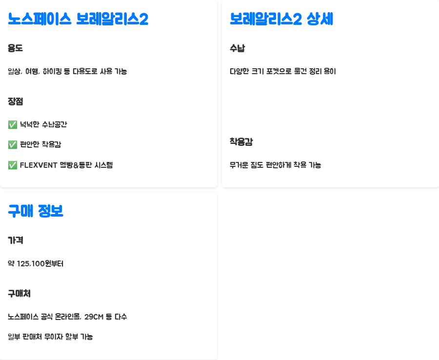 오늘 노스페이스 보레알리스2에 대해 자세히 알아보았는데요, 어떠셨나요? 다양한 기능과 세련된 디자인, 그리고 합리적인 가격까지 갖춘 매력적인 백팩이죠.